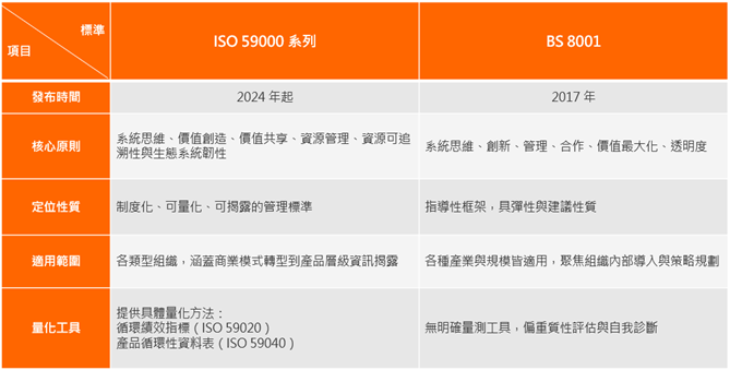 BS 8001 著重於原則導向與文化轉型,內容聚焦從理念啟發到實務導入的流程,具有高度彈性,適合企業或組織依據自身情境調整策略。相較之下,ISO 59000 系列涵蓋循環原則建立、商業模式轉型、價值網絡盤點到產品層級資訊揭露等完整流程,並透過 ISO 59020 與 ISO 59040 等相關標準,提供具體的績效量化方法與資料格式。整體而言,BS 8001 適合循環經濟導入的初期階段,而 ISO 59000 系列則提供更系統化且可量化的標準依據。