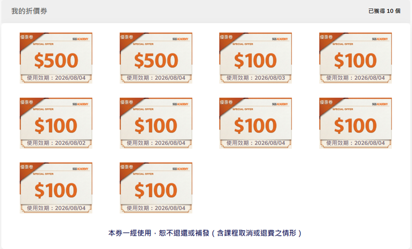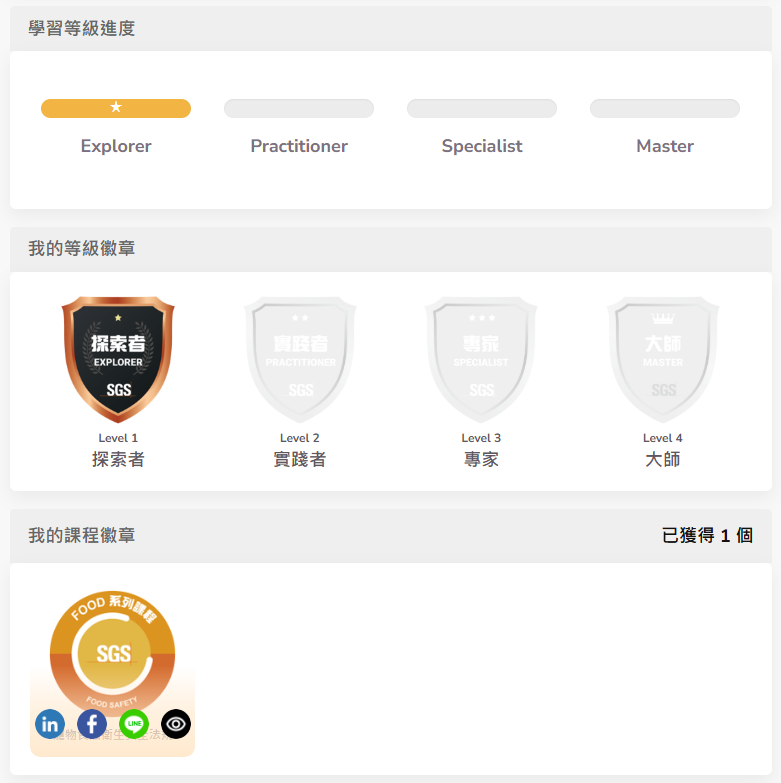 為此,SGS 數位學苑正式推出「學習徽章系統」!現在起,你在平台的每一步學習軌跡都將被記錄。不僅能獲得專屬數位徽章,一鍵分享至 FB、LINE 和 LinkedIn 展現實力,還能隨著等級提升,解鎖最高 2,500 元 的課程折價券!